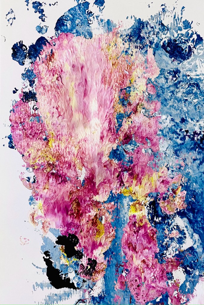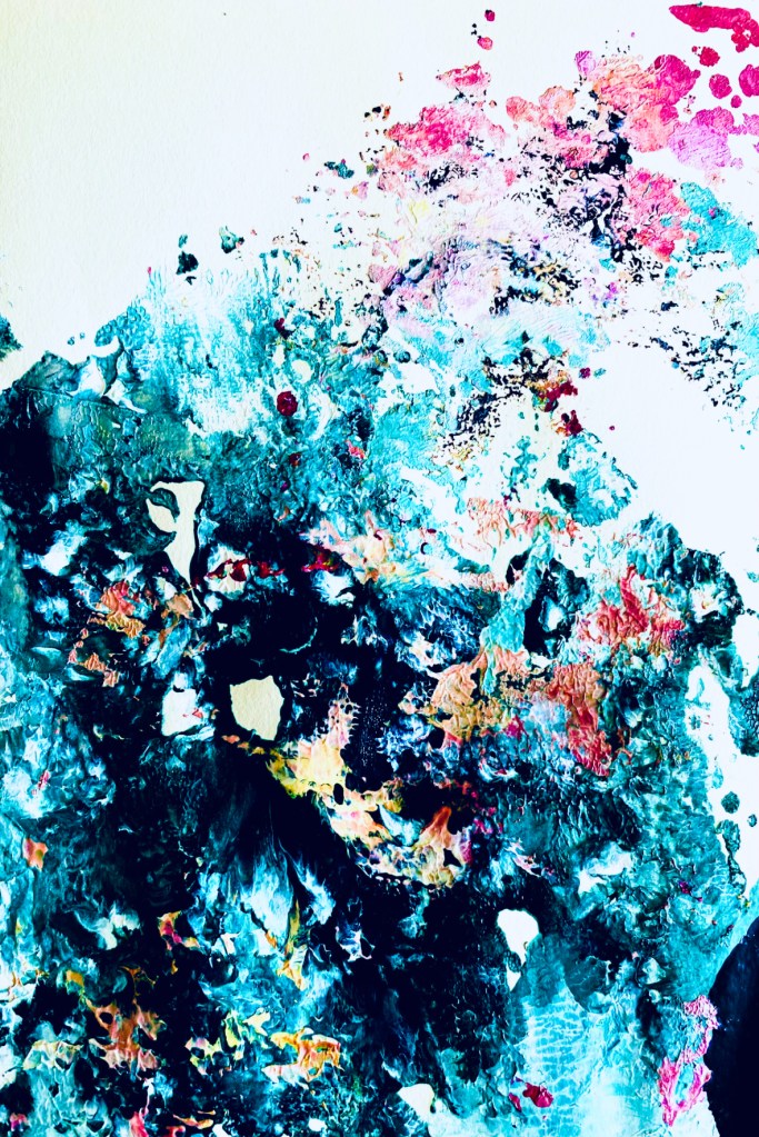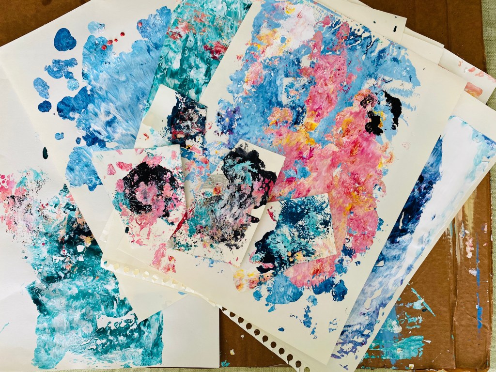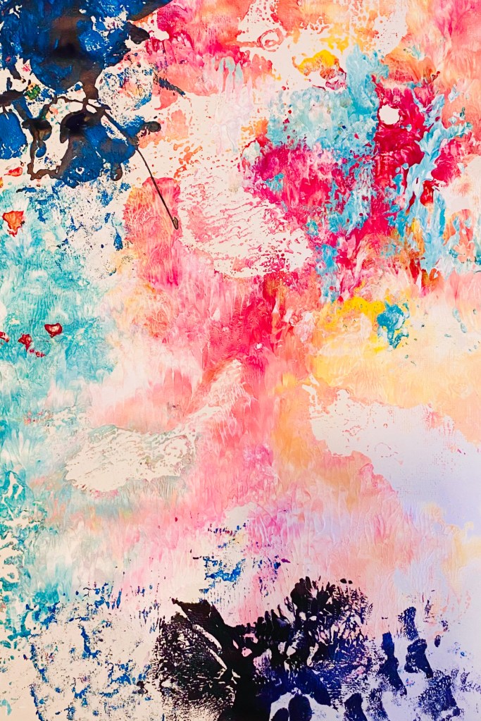 I used artpaper to soak up the splodges of different colours and then built up the layers by removing or adding more splodges of colour to create the new piece. Then I photographed the pieces of artpaper, zooming in on interesting patterns and colour combinations and digitally enhanced the images to create the digital artworks in the gallery below.