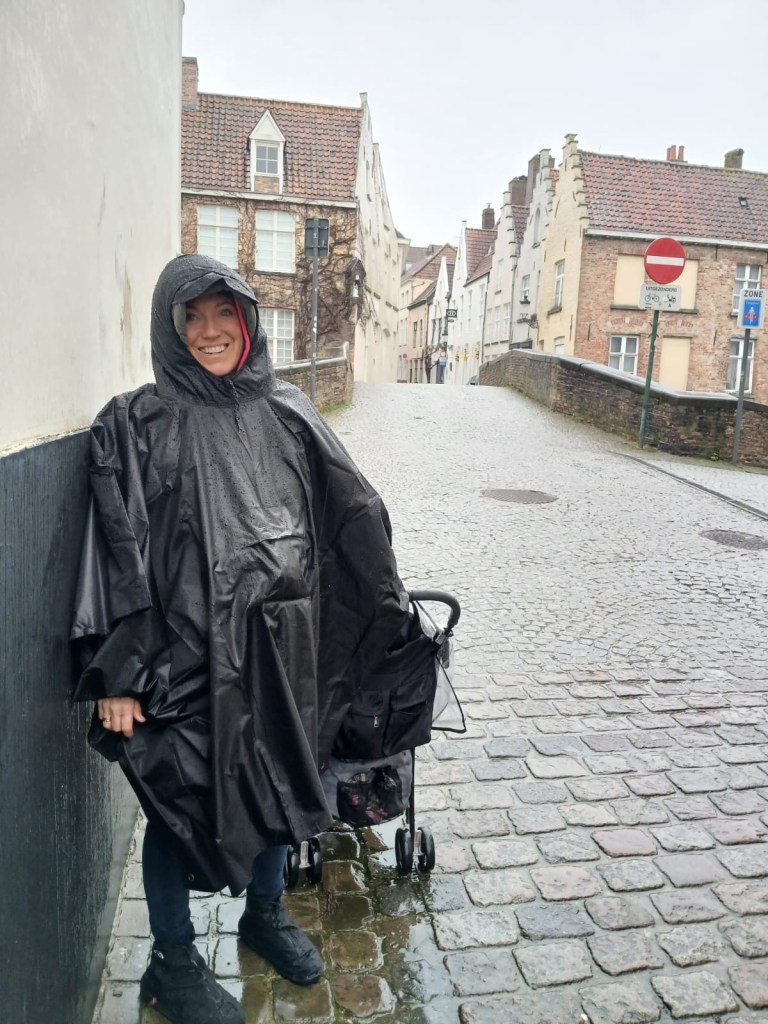 Here I am, glamourous as always, with a camera under my poncho, and Pixie (our sausage dog) snuggled up under blankets and a waterproof cover in her buggy. Despite the weather, this was one of our favourite stops on our epic winter road-trip. If, like me, you’re a big fan of twinkly lights and sparkles in general, Bruges at Christmas is most definitely the place for you!